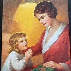 Maleri, gammelt tryk, to piger foran spejlet, vintage