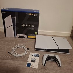 PlayStation 5-konsol med en trådlös DualSense-handkontroll. Konsolen har 1 TB lagringsutrymme.