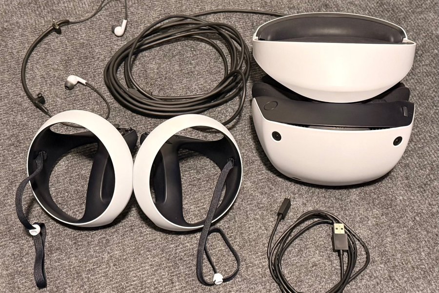 PlayStation VR2-headset med tillbehör enligt bild.