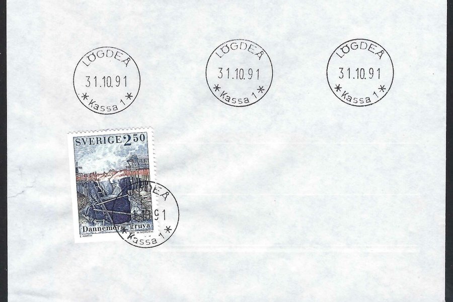 Försändels stämplad sista dagen för öppet av postorten LÖGDEÅ 31.10.91, (Ångermanland, AC-län). Frankerat med märke ur serien "Järn bryter bygd". Lögdeå var postort 1909.12.01 - 1991.10.31. Objektet säljs i befintligt skick och skickas som vanligt brev