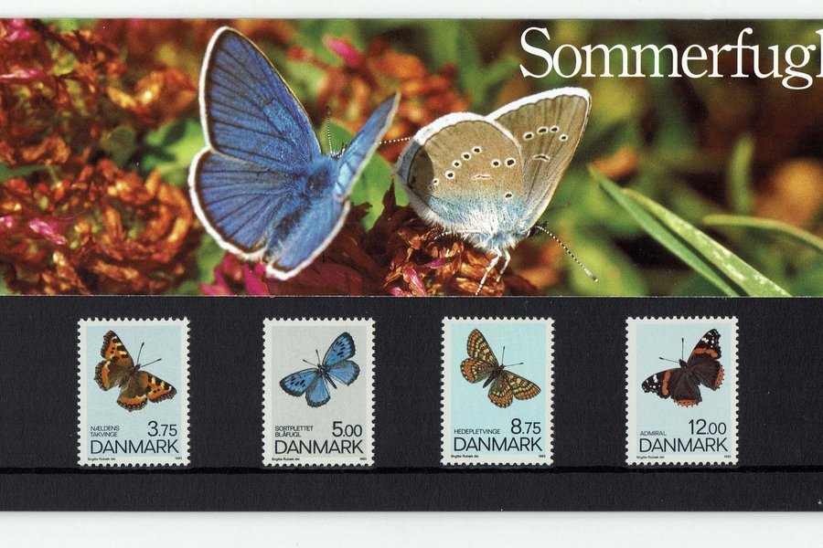 Souvenirmappe med beskrivelse af sommerfuglene ” Nældens takvinge, sortplettet blåfugl, hedepletvinge og admiral”.Postfrisk.