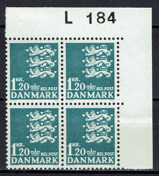 1,20 kr, Rigsvåben Grønblå. Marginal 4-blok L 184, hængslet i margen.