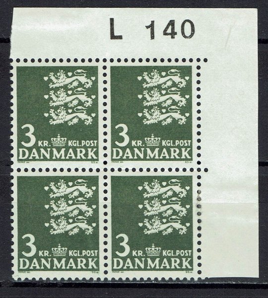 3 kr, Rigsvåben grønsort. Marginal 4-blok L 140, hængslet i margen.