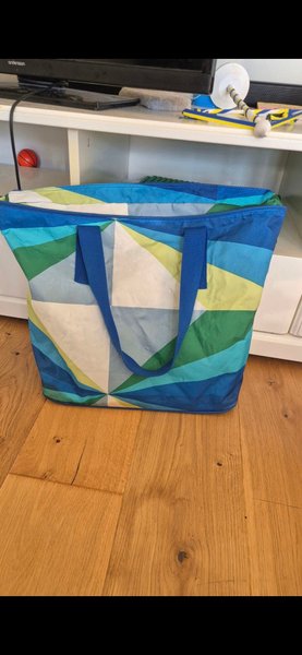En stor väska med blåa och gröna nyanser. Perfekt för shopping eller utflykter.