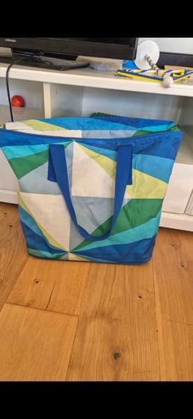 En stor väska med blåa och gröna nyanser. Perfekt för shopping eller utflykter.