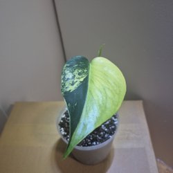 Frisk och välmående. Perfekt för samlare.Plantan är rotad i jord och har en mosstock. Bladen uppvisar brokighet. Luftrötter är synliga.