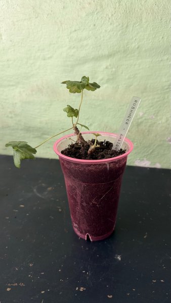 En stickling av pelargonen 'Rushmoor Amazon' planterad i en plastmugg. Sorten är känd för sina unika blad.