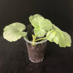 En rotad stickling av pelargonen 'TS-Maya'. Sorten är känd för sina vackra, fyllda blommor i nyanser av rosa och vitt. Bladen är gröna och lätt ludna. En fin tillväxt med flera bladpar.