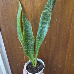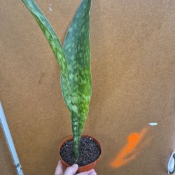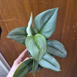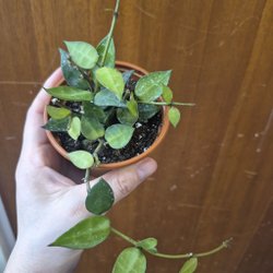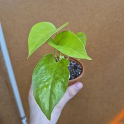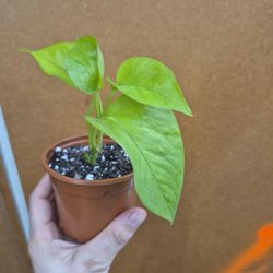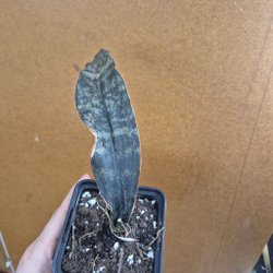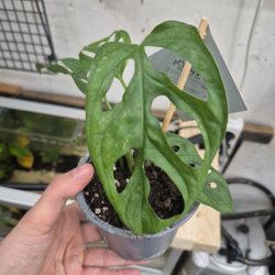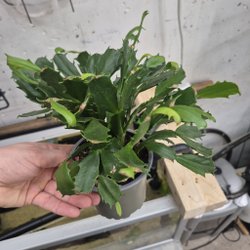 Hibiskusplanta i kruka. Bladen är mörkgröna och glansiga. Plantan har en upprätt stam och flera blad.