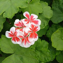 ”Zonalpelargon. Enkla röda blommor med vita kanter.