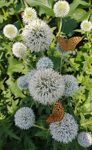 Vacker vit bolltistel med fjärilar. Perfekt för trädgården eller som snittblomma.
