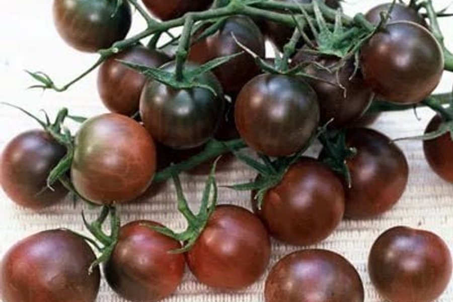 Säljer frön av sorten 'Black Cherry'. Dessa ger rikligt med små, mörka tomater med en söt och komplex smak.