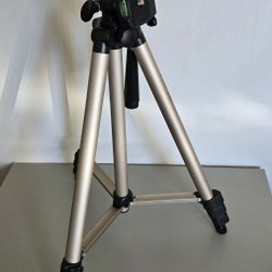 Kamerastativ med justerbara ben och handtag. Stativet har en snabbkopplingsplatta för enkel montering av kamera. Benen är utrustade med gummifötter för stabilitet på olika underlag. Stativet är hopfällbart för smidig transport och förvaring.
