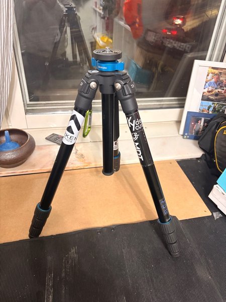Stativ från Benro. Stativet är svart med blå detaljer. Det har tre ben som kan fällas ut och justeras i längd.