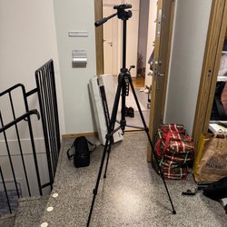 Svart kamerastativ med justerbara ben och ett handtag för enkel manövrering. Stativet har en standardfästeplatta för kamera.