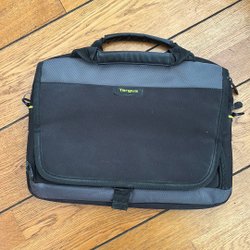 Säljer en datorväska från Targus. Väskan är i svart tyg och har plats för en dator och andra tillbehör. Den har ett handtag samt en axelrem.