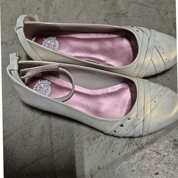 Säljer ett par beige ballerinaskor från Marmelata med rund tå, dekorativa sömmar och små silvriga nitar framtill. Skorna har en smal rem över vristen och innersula i ljusrosa satinliknande material. Perfekta för dig som gillar en söt och stilren look.