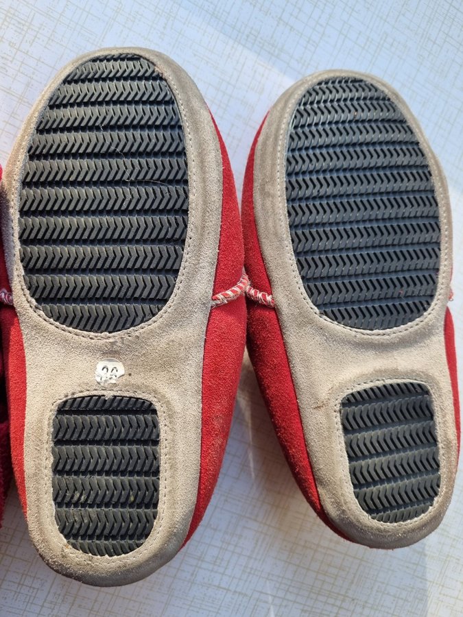 Set med röda tofflor av skinn med ullfoder från svenska Åselda i fint skick,