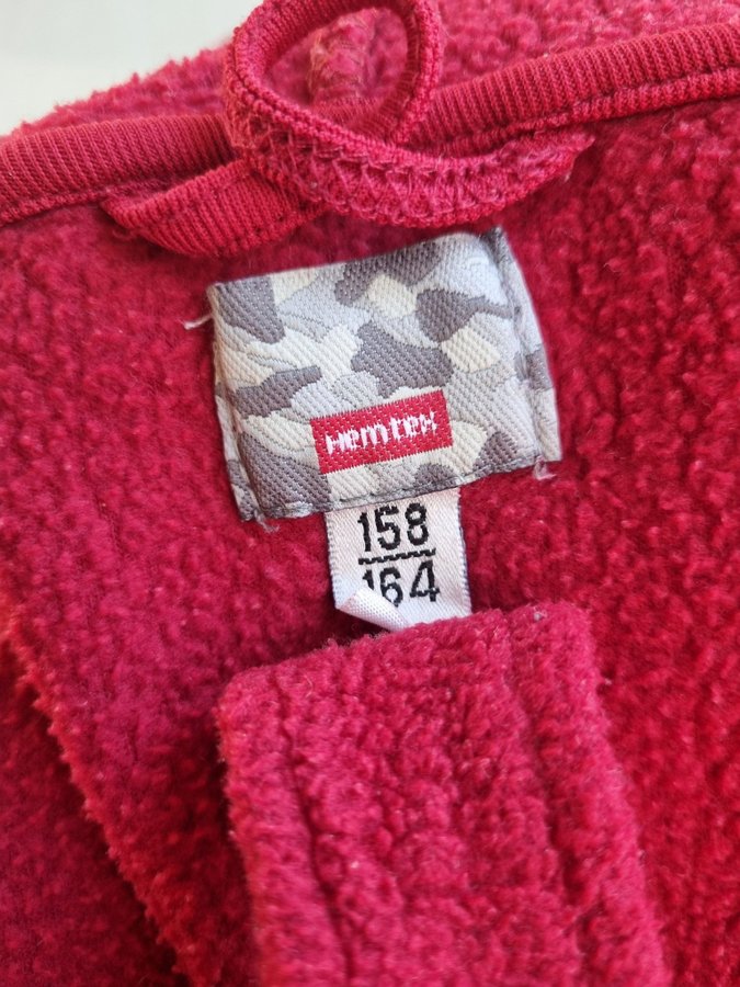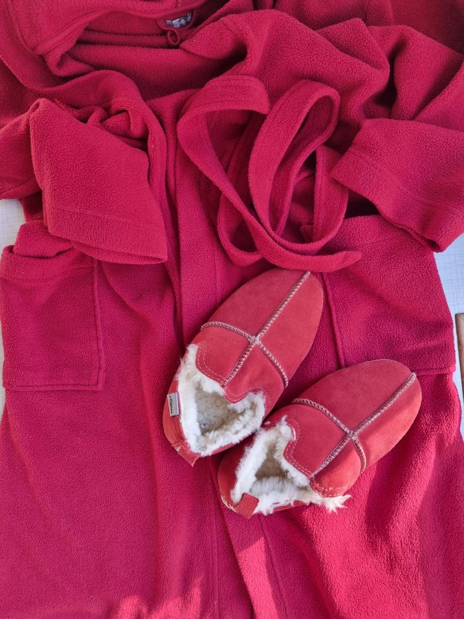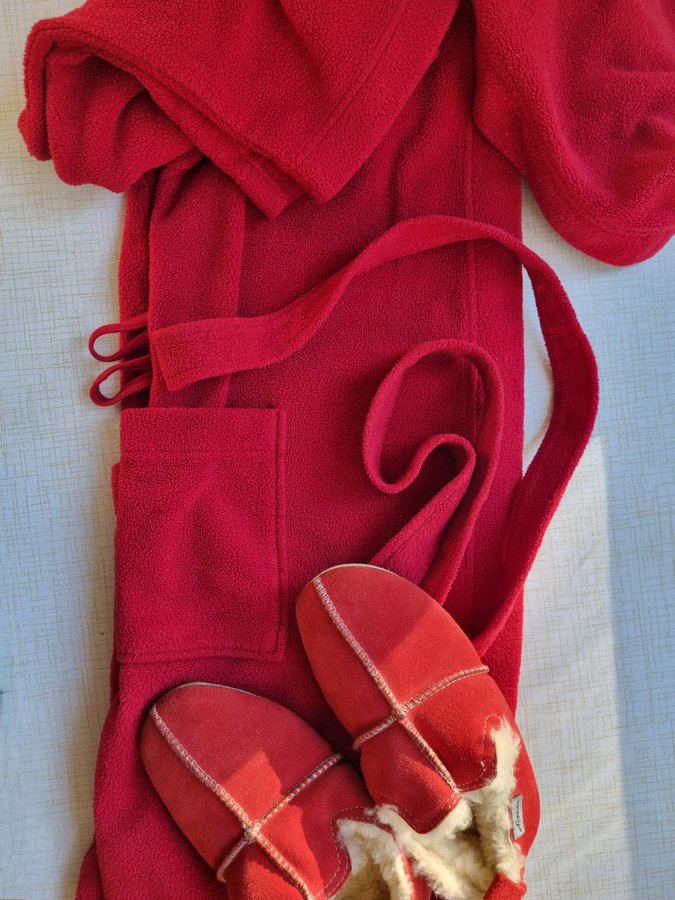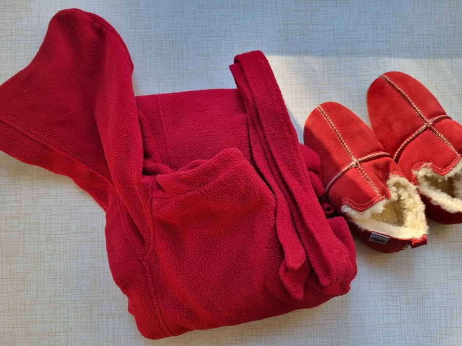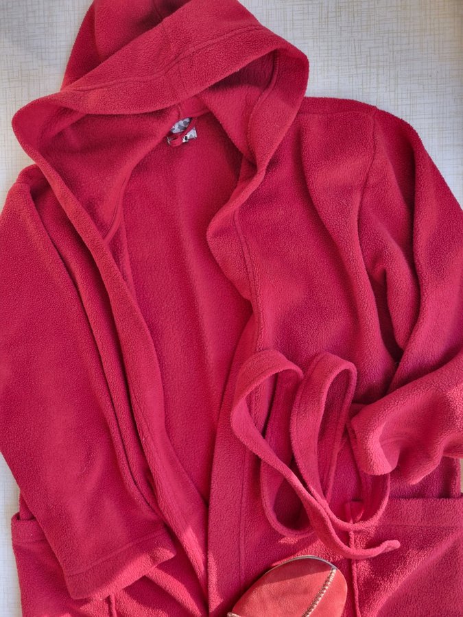 samt en röd morgonrock av fleece från Hemtex med huva, fickor och knytband.
