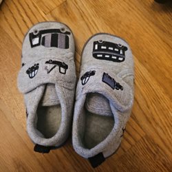 Enhörningstofflor i storlek 32-33. Lite gråsmutsiga under sulorna och en liten fläck på sidan, i övrigt fina.