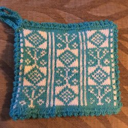 Ett par stickade vantar i ett mönster av mörkbrunt och benvitt. Muddarna är i benvitt och slätstickade. Tummen är mörkbrun.Handsticjade i suoerwash ull. Storlek Herr/Dam