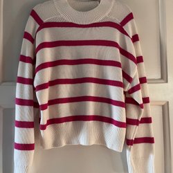 Grå stickad mössa med en stor fluffig tofs. Mössan har ett ribbstickat band runt kanten. Från lager157, omkretsen ca 47 cm, från djur och rökfritt hem