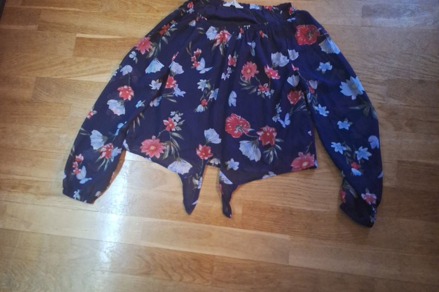 Blus med långa ärmar och blommigt mönster. Blusen har en knut i midjan.