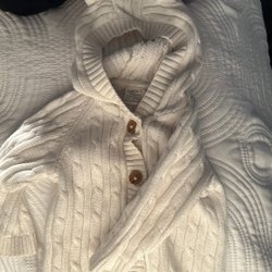 En vit kofta med flätmönster och knappar framtill. Koftan har långa ärmar och en rund halsringning. Passar bra för att komplettera en outfit.