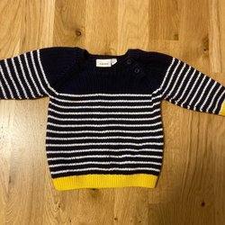 En hyggelig, strikket trøje i en flot blå farve. Trøjen har lange ærmer og en rund halsudskæring. Den er strikket i et klassisk mønster, der giver den et tidløst udseende.