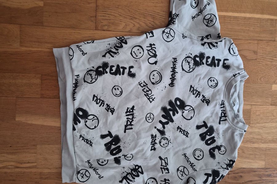 Tröja med långa ärmar och rund halsringning. Mönstrad med text och smileys i svart.