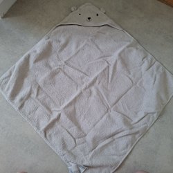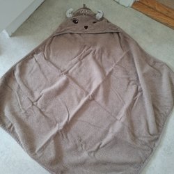 Grå, fluffig fleecejacka med huva och små öron på toppen.
