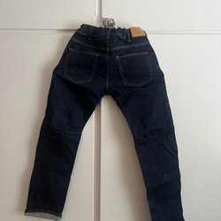 Ett par ljusblå jeans med många fickor, både fram och bak. Byxorna har resår i bensluten.