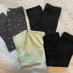 Här är ett set med leggings. Ett par är svarta med guldiga detaljer nedtill och guldiga ränder upptill. Ett par är mörkgrå och ett par har ett mönster med blad i olika blåa nyanser.