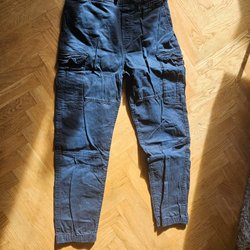 Ett par blå byxor med resår i midjan och breda ben. Storlek 140. Material 100 % bomull