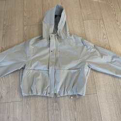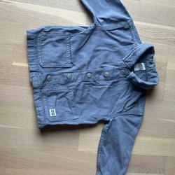 Grå jacka med tryckknappar framtill. Jackan har muddar med ränder vid ärmslut och nedtill. En liten ficka med dragkedja finns på ena ärmen.
