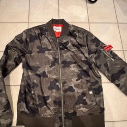 Grön jacka med huva och dragkedja framtill. Jackan har ett mönster i olika nyanser av grönt och vita detaljer. Den har även två fickor med dragkedja fram.