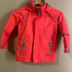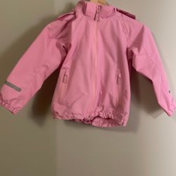 Rosa jacka med ett vågigt mönster i en ljusare nyans av rosa. Jackan har en huva och dragkedja framtill, samt fickor med dragkedja på sidorna. Jackan har en svart fläck vid högra fickan på bild 3.
