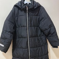 Svart pufferjacka med hög krage och dragkedja framtill. Jackan har en liten ficka med dragkedja på bröstet.