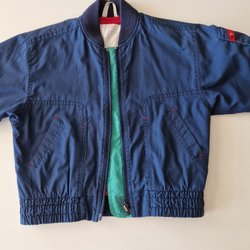 Marinblå vadderad jacka med dragkedja och stickade detaljer i mörk blå, orange och vitt. Jackan har ett litet märke på bröstet.