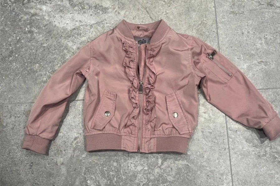 Rosa bomberjacka med volangdetaljer längs dragkedjan framtill. Jackan har ribbade muddar i ärmslut och nederkant samt två fickor fram med tryckknappar. En liten ficka med dragkedja finns även på vänster ärm.