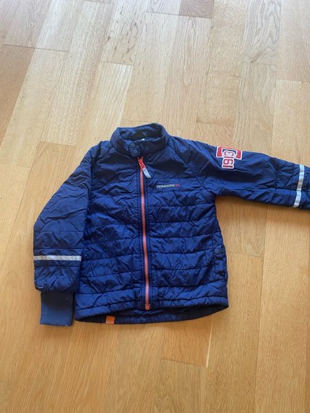 Blå Didrikson jacka med dragkedja framtill. Jackan har muddar i ärmarna och en liten Didrikson logga på bröstet. På ena ärmen finns en ”1913” logga och reflexer. Storlek 110
