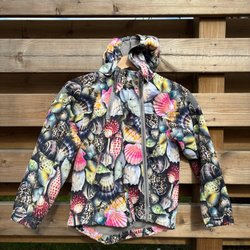 Grågrönmönstrad (rosor i kamouflagestil) jacka med dragkedja och huva från H&M. Jackan har en dekorativ hjärtapplikation på ena ärmen och dragsko i midjan. Fickor fram med tryckknapp.