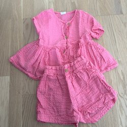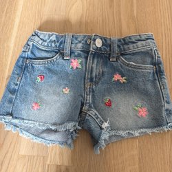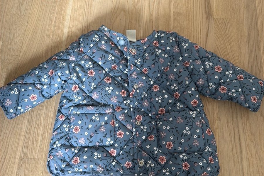 Vadderad jacka med blommigt mönster i blått, rosa och vitt. Jackan har en rundad halsringning och knäppning framtill med tryckknappar. Två fickor framtill.