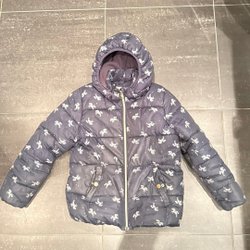 Marinblå vinterjacka med huva. Jackan har ett mönster med enhörningar och stjärnor. Den stängs med dragkedja fram och har fickor.