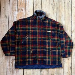 The jacket has a zipper and buttons at the front and two pockets.