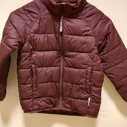 Vinröd vadderad jacka med dragkedja fram och huva. Jackan har även dragkedjor på fickorna.