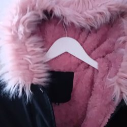 Rosa vadderad jacka med huva och fuskpäls. Jackan har en dragsko i midjan och knappar fram. Behöver tvättas
