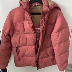 Rosa jacka med luva och tryck av en nalle på bröstet. Jackan har ett svart band i midjan och ett svart-vitt prickigt mönster på insidan av luvan och ärmarna.