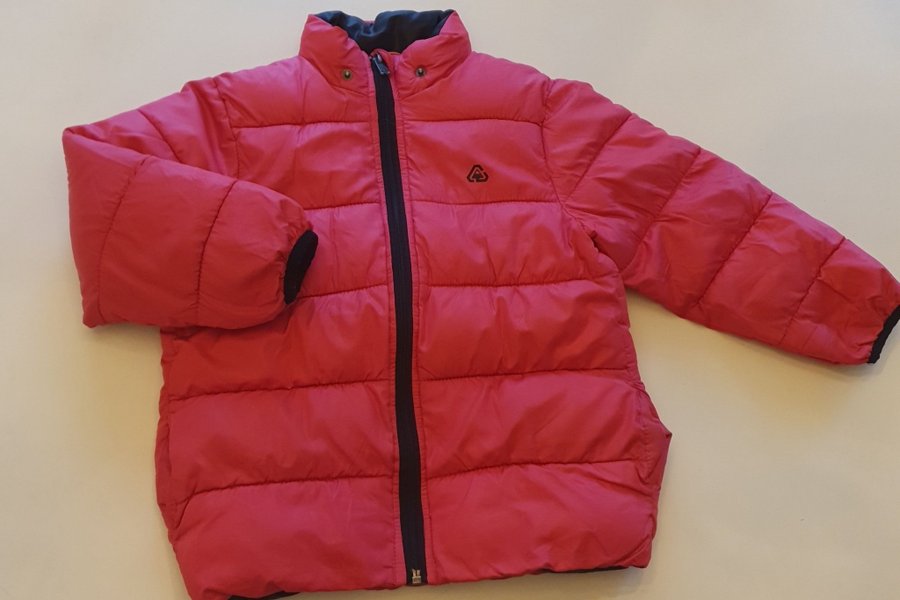 Vadderad jacka i en stark rosa färg med svart dragkedja och detaljer. Jackan har en liten logotyp på bröstet.