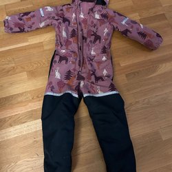 Vinteroverall i en lila nyans med svarta detaljer nedtill. Overallen har dragkedja framtill och en huva.